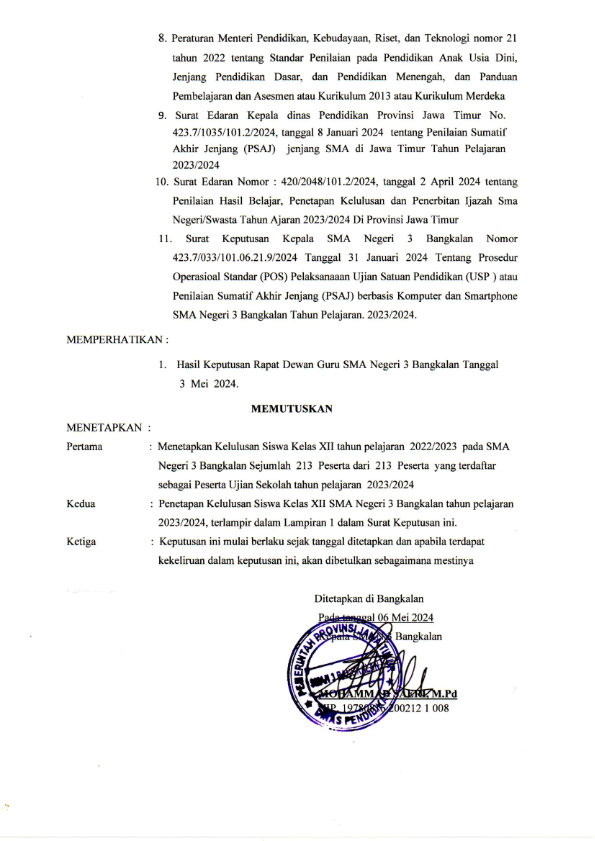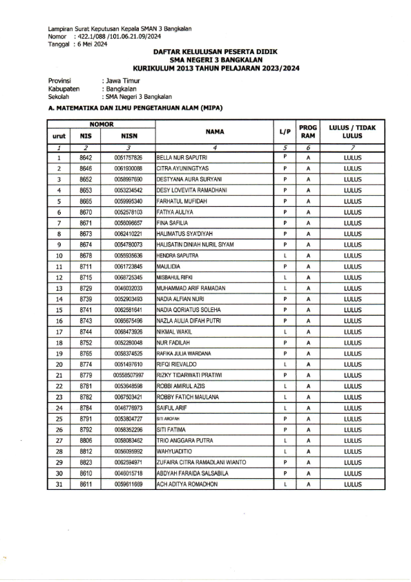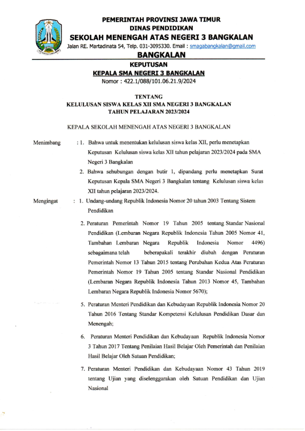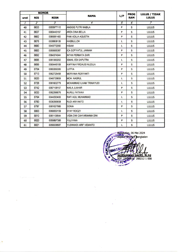 Bagi siswa yang membutuhkan Surat Keterangan Lulus (SKL) dapat menemui petugas di ruang Tata Usaha (TU), mulai hari ini, Senin – tanggal 6 Mei 2024 pada jam kerja. Terima kasih.