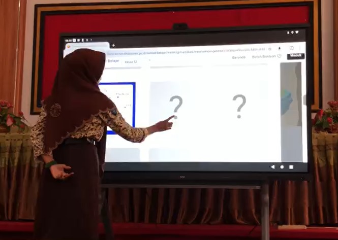 Dalam gambar yang menunjukkan kegiatan di dalam kelas, terlihat bagaimana perangkat canggih ini mulai digunakan. Seorang guru tampak memimpin pelajaran dengan materi yang ditampilkan secara visual di layar lebar, memfasilitasi interaksi langsung dengan konten digital. Siswa-siswi, terutama yang mengenakan seragam pramuka, tampak antusias mengikuti materi pelajaran.