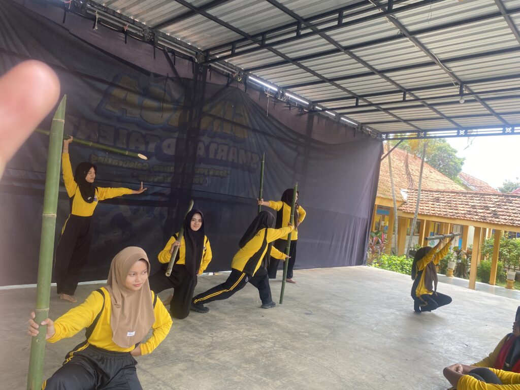 Di sisi lain, pada panggung utama yang sudah terpasang spanduk besar bertuliskan “SINAGA”, kelompok siswa dengan seragam olahraga kuning-hitam tampak sedang mendalami tarian yang lebih teatrikal. Menariknya, terlihat penggunaan properti bambu panjang, yang mengisyaratkan adanya unsur tari tradisional atau kreasi seni budaya yang kuat dalam penampilan mereka nanti.